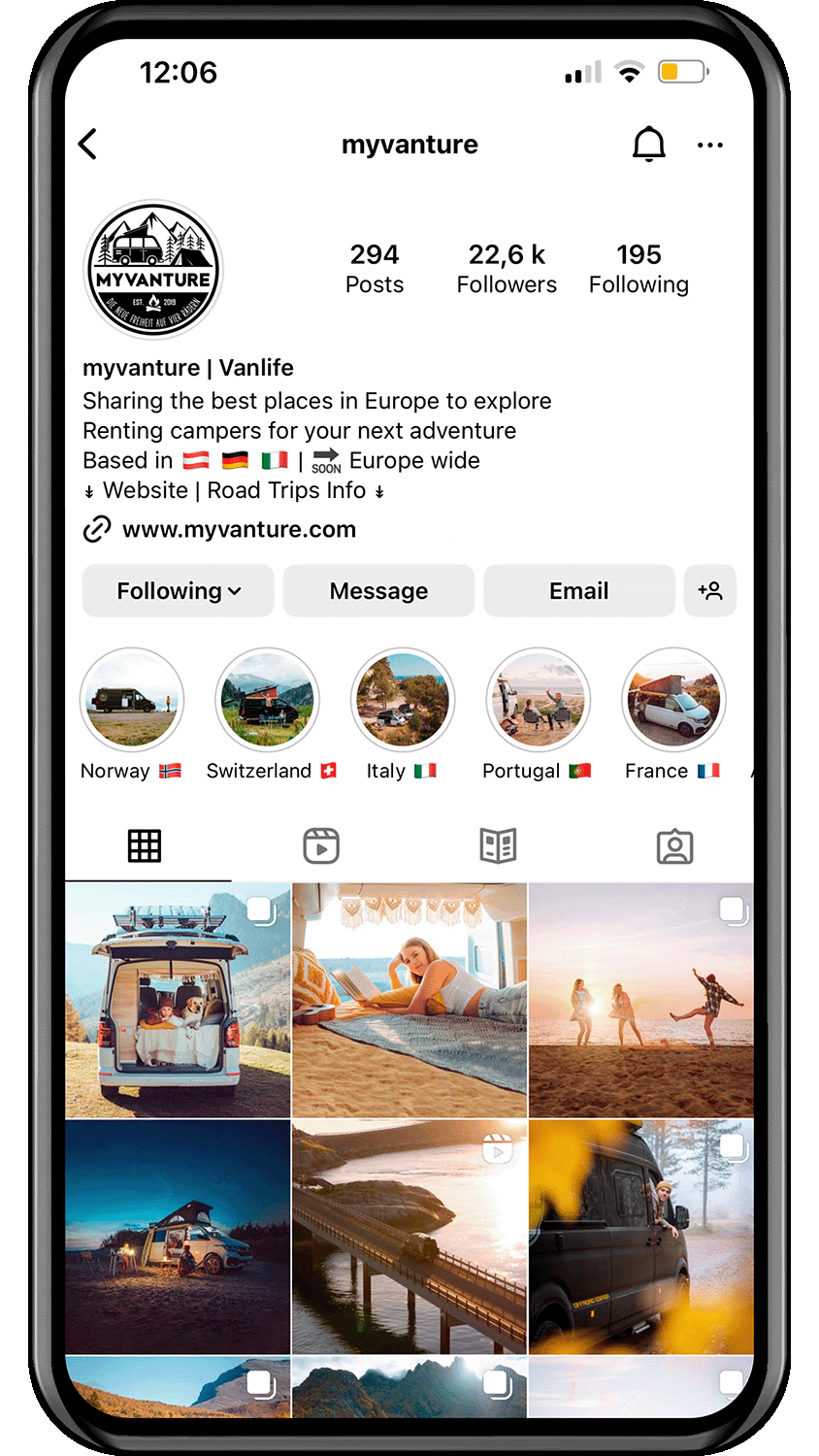Die Social-Media-Kanäle waren technisch vorhanden, aber nicht strategisch genutzt. Bio, Hashtags und Content-Ausrichtung waren nicht optimiert. Trotz regelmäßiger Posts wuchs die Community kaum und myvanture war in der europäischen Vanlife-Szene digital kaum sichtbar.